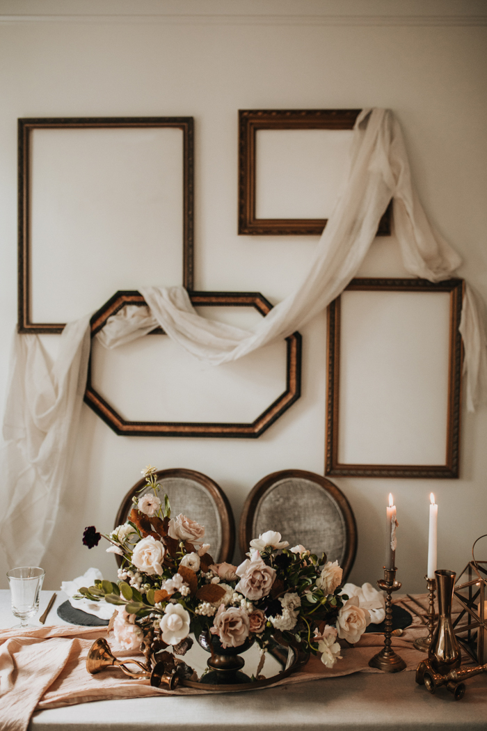 Lniany obrus, stare ramy, świece i kwiaty. Cudowna inspiracja.