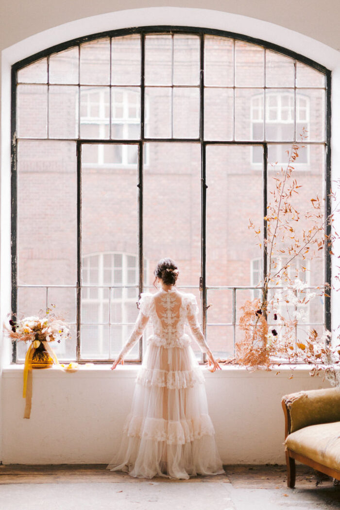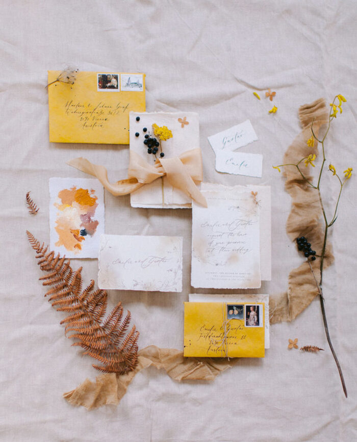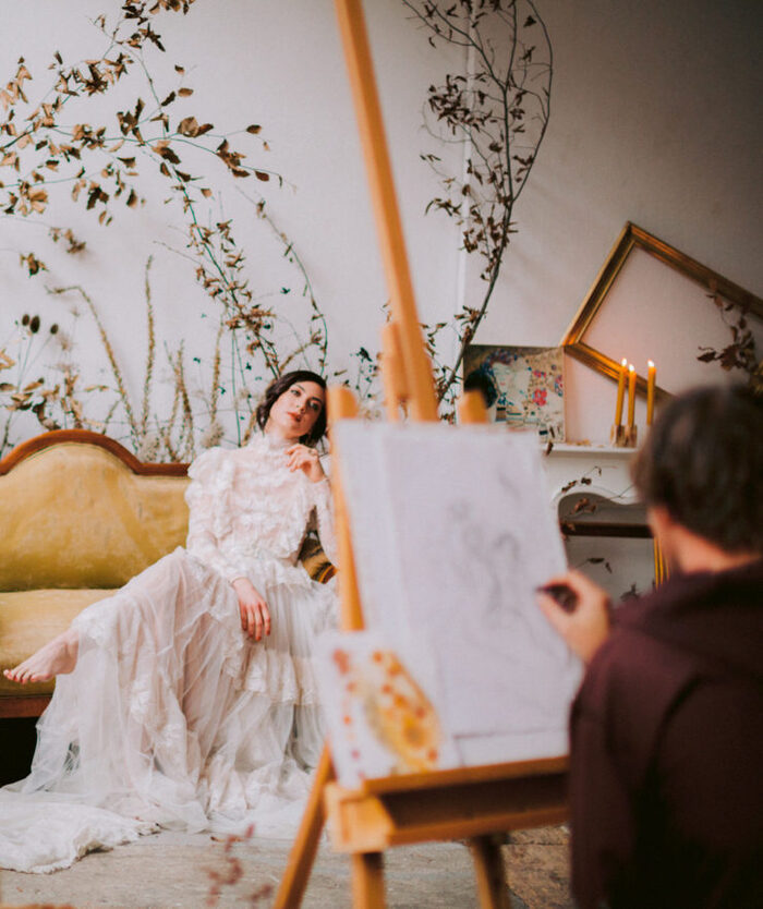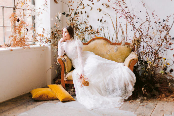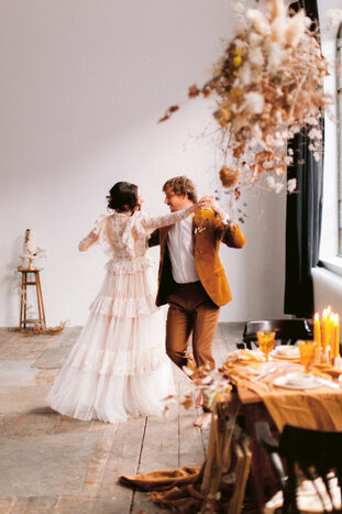 Sesja rozgrywa się w przytulnej scenerii z wiszącą kwiatową instalacją nad stołem w kolorach żółci i czerni z kaskadowo suszonymi kwiatami, które są doskonale w tym swoim rozgardiaszu. Mezzinoi doskonale uchwycili magię tej intymnej inspiracji ślubnej dzięki najpiękniejszym sukienkom z długim rękawem, jakie kiedykolwiek widzieliśmy.
