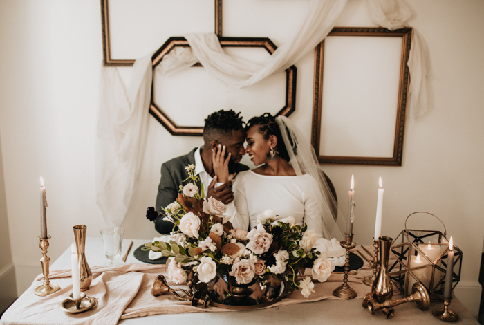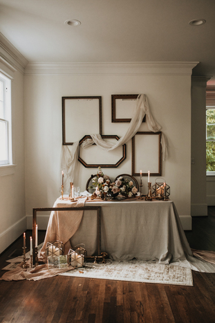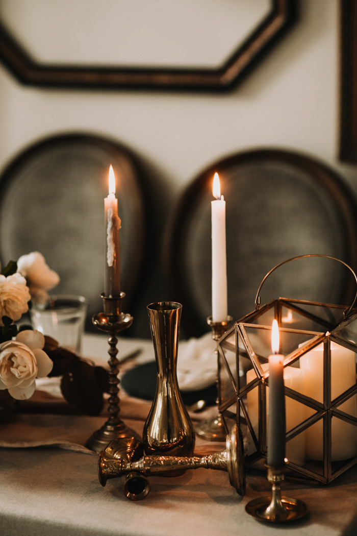 Lniany obrus, stare ramy, świece i kwiaty. Cudowna inspiracja.